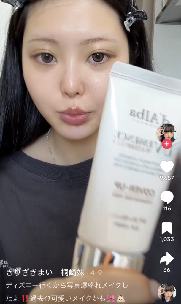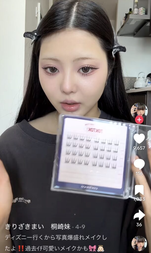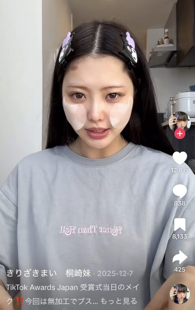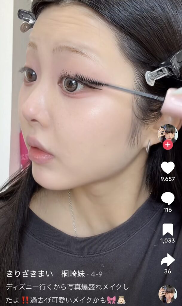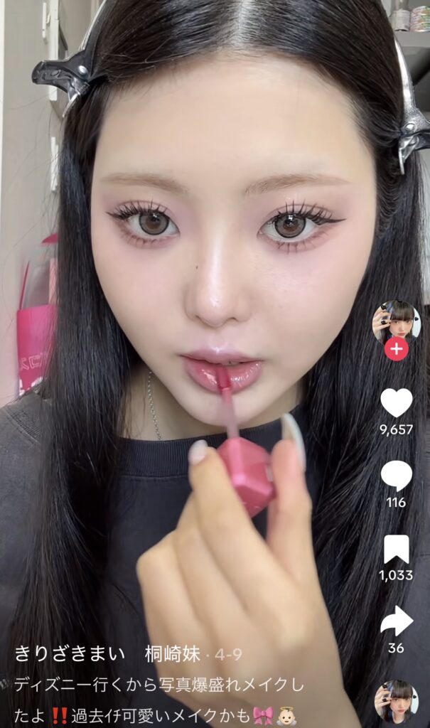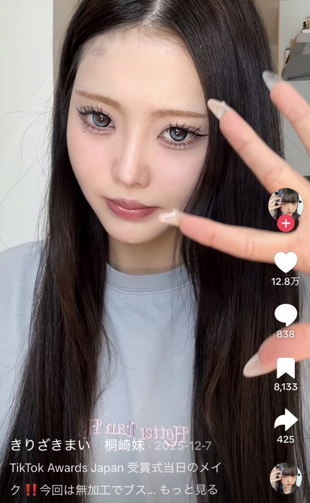 桐崎まいのメイクの特徴は、やはりK-POPアイドル風のナチュラルな印象で、透明感と写真映えする華やかさが両立されています。