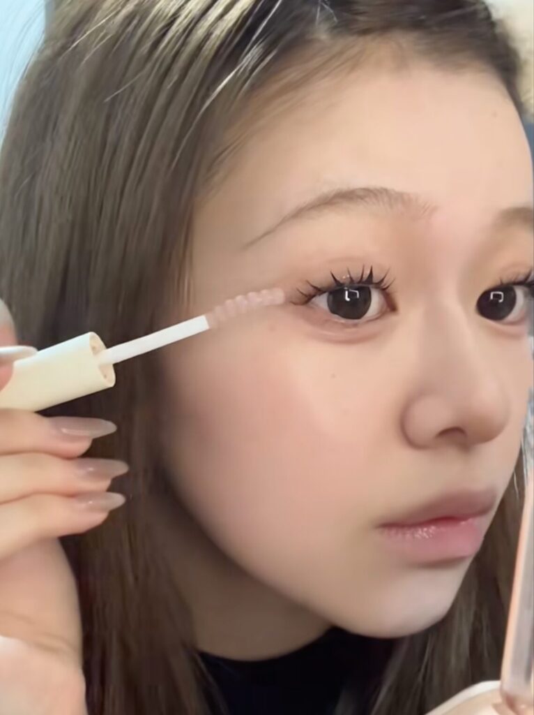 まつエクをしている米澤りあは、マスカラではなく美容液でまつ毛を束ねています
